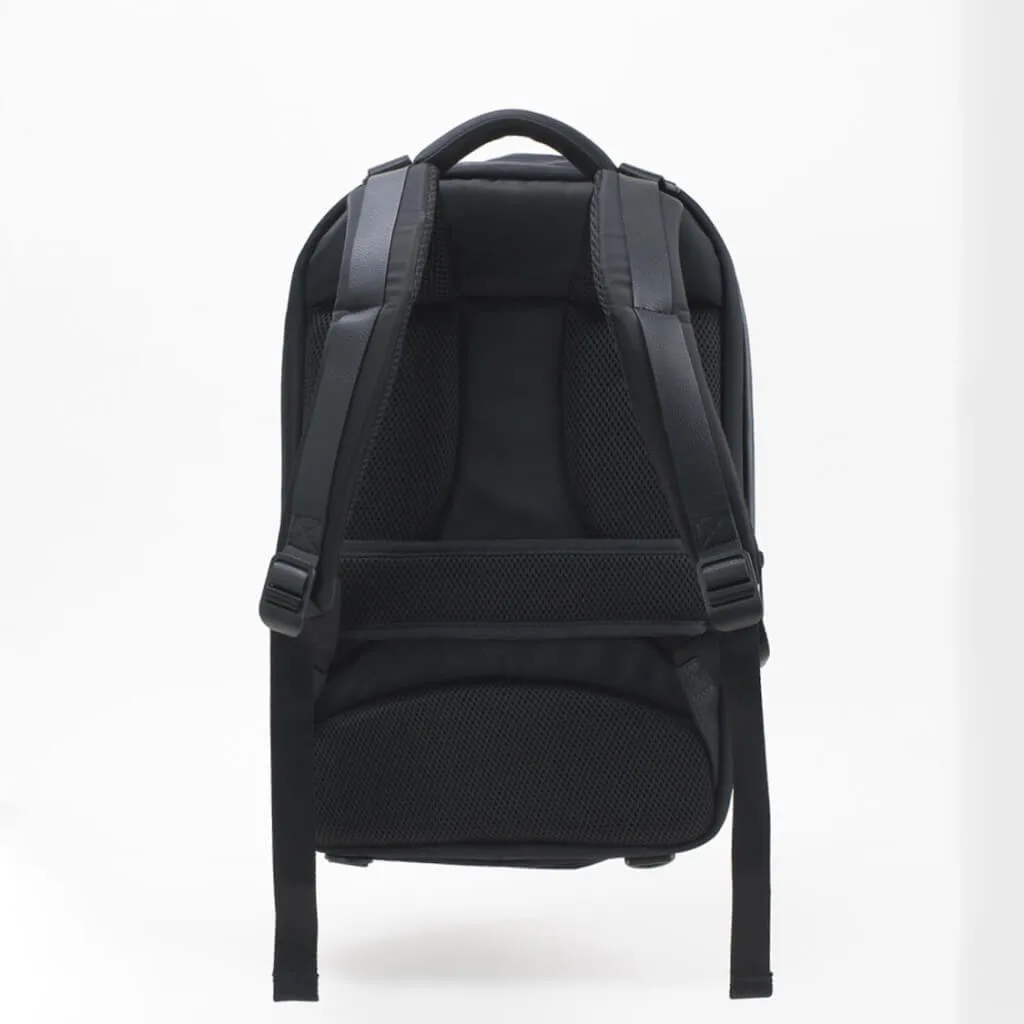 Спинка рюкзака має м'які вставки і вентильоване покриття. Горизонтальний ремінь на спинці призначений для того, щоб фіксувати рюкзак на висувній ручці валізи. Плечові лямки анатомічної форми швидко регулюються за довжиною. Для перенесення рюкзака в руці є ущільнена ручка зверху.