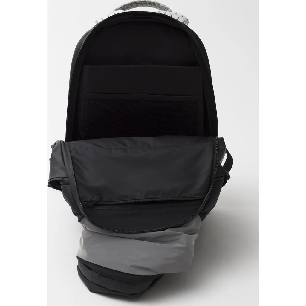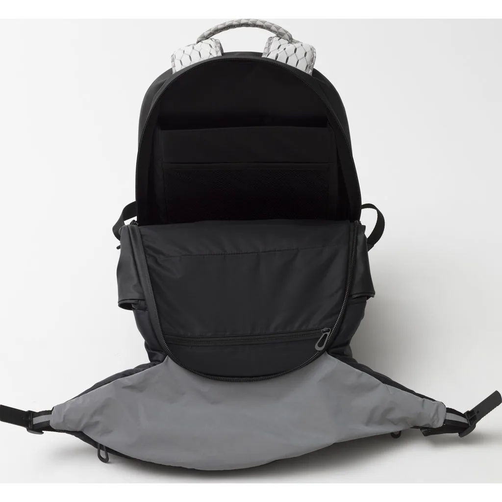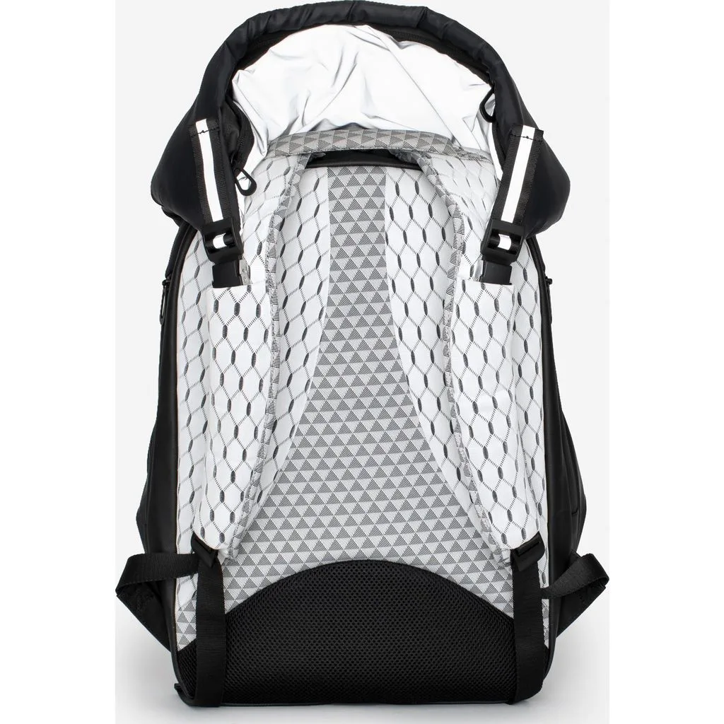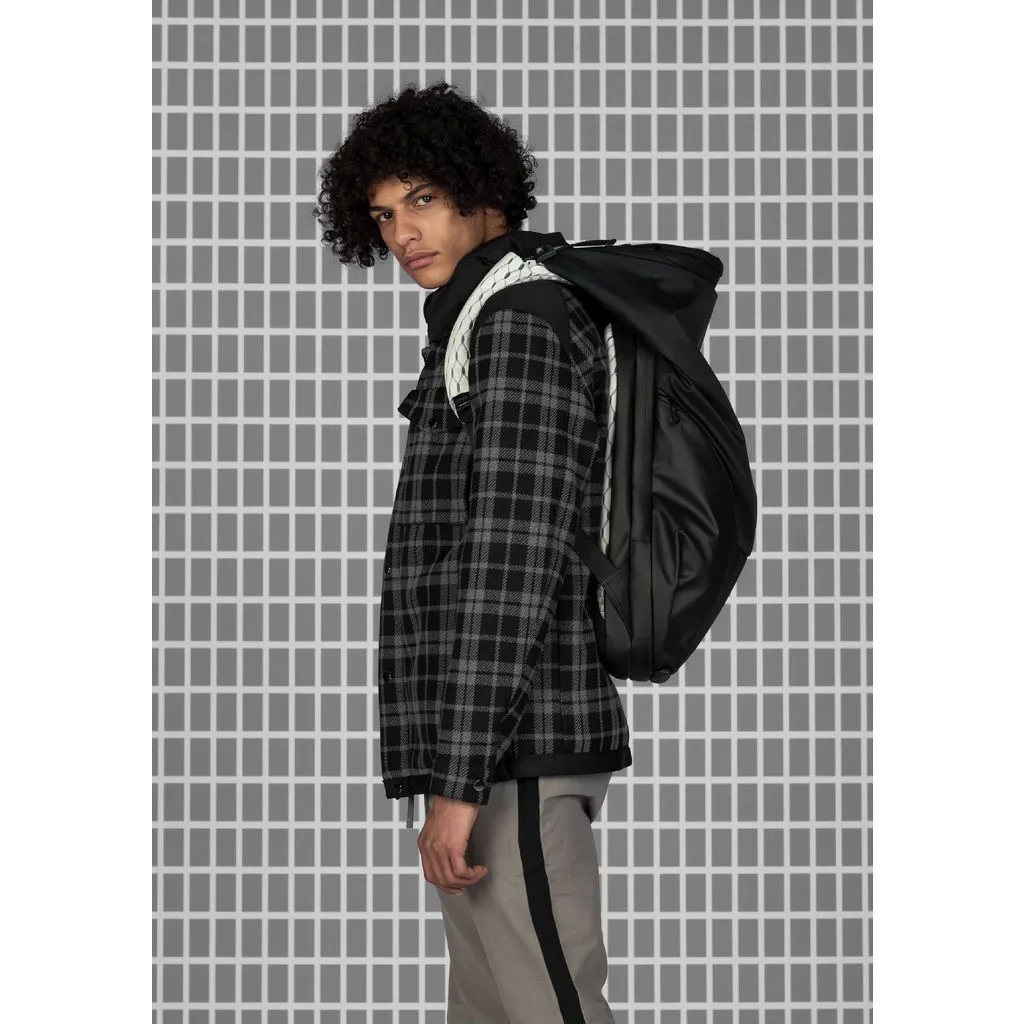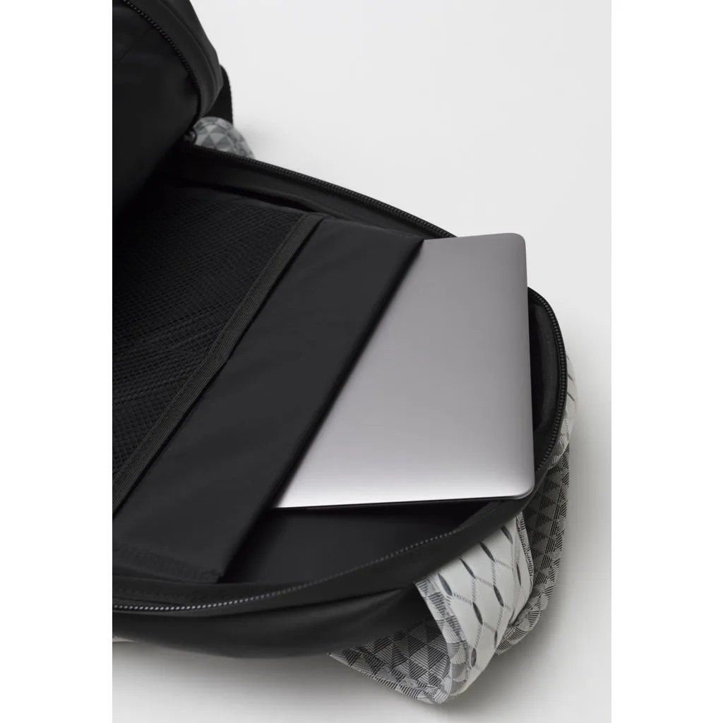 Рюкзак у формі кокона Nile Mimas Black виготовлений з декількох видів легких тканин, які мають водонепроникні характеристики. Передня сторона виконана в чорному кольорі, а задня сторона разом з рюкзачними лямками в білому кольорі з геометричним принтом. У рюкзака є елементи сірого кольору, які змінюють відтінок залежно від кута огляду та освітлення, також є шкіряні та металеві елементи.