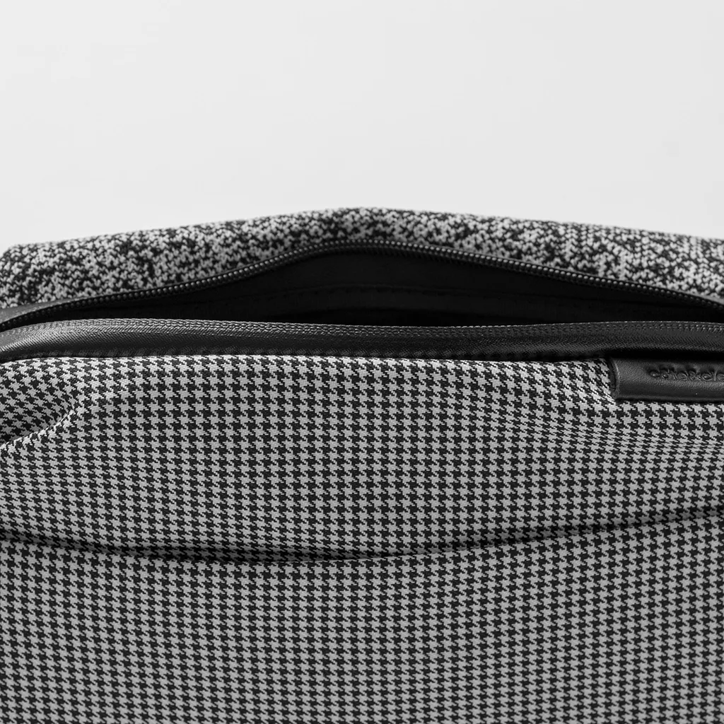 Изделие выполнено из полиэстера с разной текстурой в черно-белых тонах. Задняя сторона изготовлена в виде вязки. Отделения закрываются молниями. Металлическая фурнитура имеет матовое покрытие.