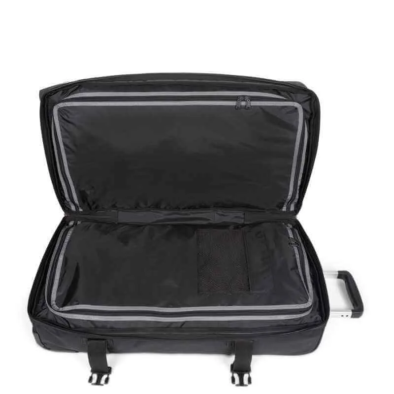 Валіза Eastpak Transit'R L 121L Bold BTR Black — це валіза великого обсягу для подорожей. Вона має м'який корпус і оснащена двома колесами. Дорожній аксесуар з удосконаленим дизайном має два внутрішніх основних відділення. Кожне з них застібається блискавкою. Додатково є невелика кишеня для дрібниць всередині і ще одна кишеня знаходиться зовні.